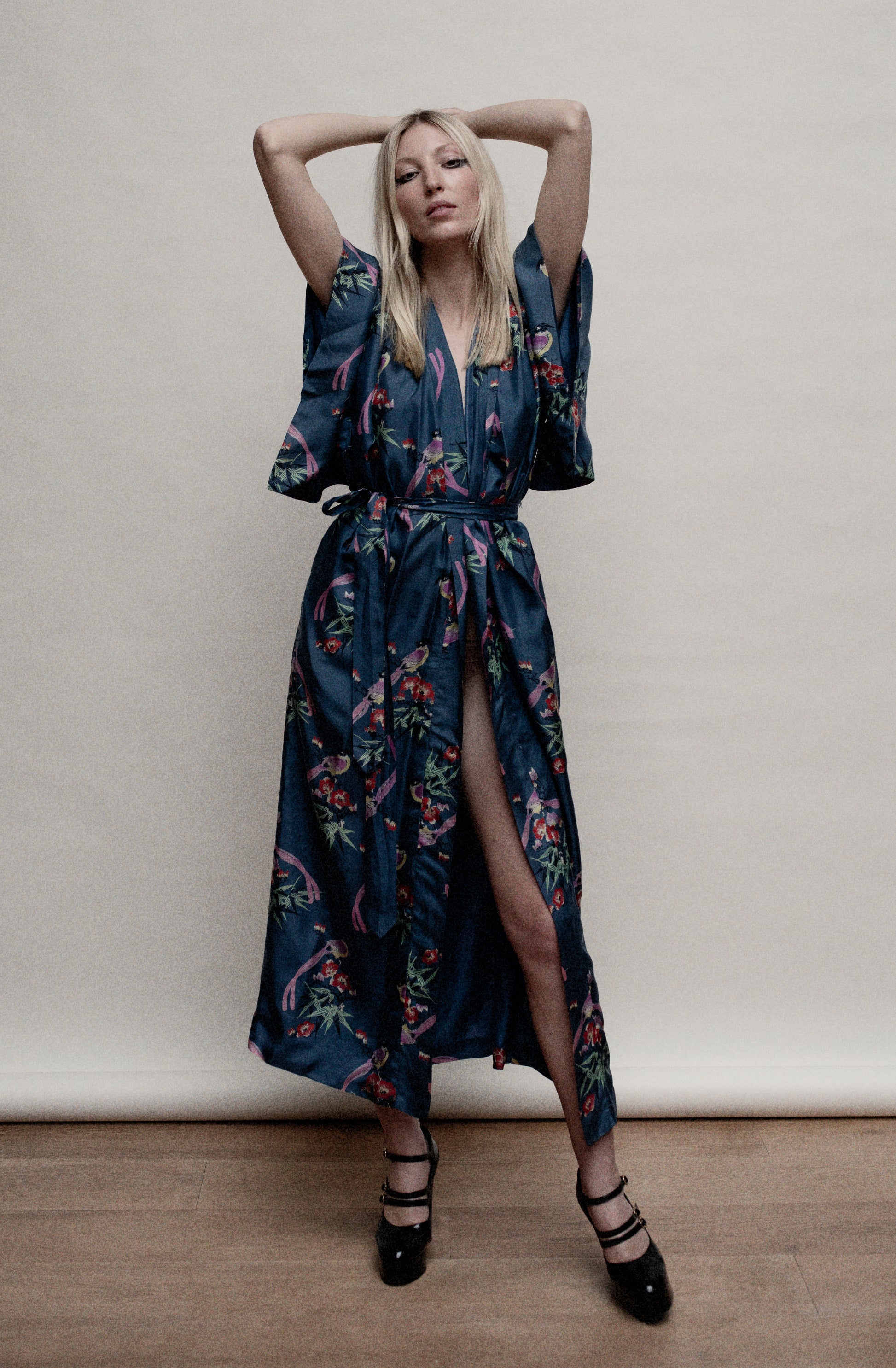 Elevate your style with our 1940’s Satin Kimono Robe. The long length provides coverage while the short sleeves add structure, making it versatile for day or night wear. Made from lustrous pearl satin, with wide-cut sleeves and an adjustable fit, it's perfect as a luxurious robe, evening dress, or paired with a simple top and jeans.