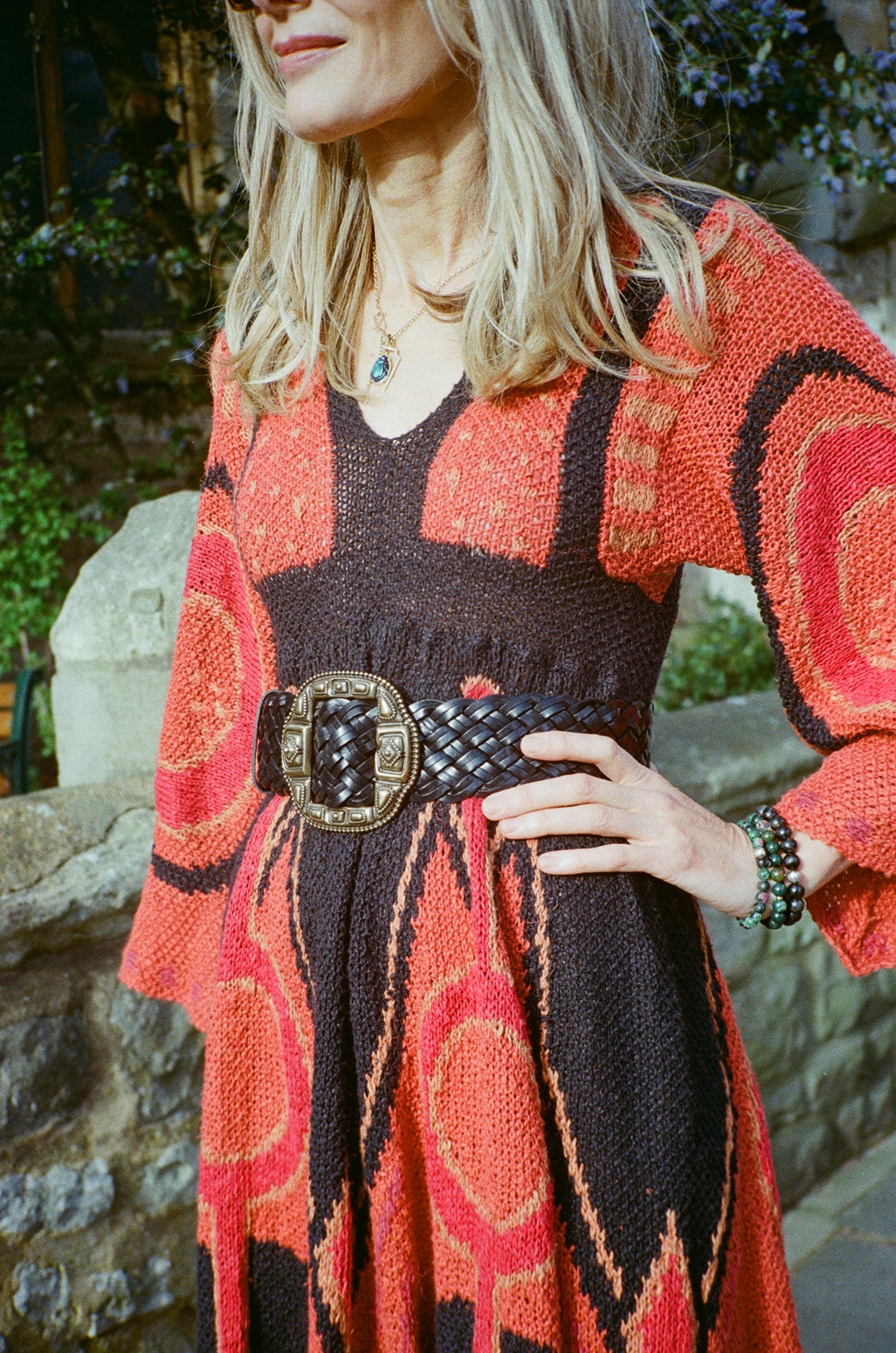 This 70's Intarsia Knit Dress combines vintage style with modern comfort. Made of soft cotton, it features a knee-length cut and flared sleeves for a flattering fit. The black, orange, and red geometric pattern adds a bold touch to this classic piece.