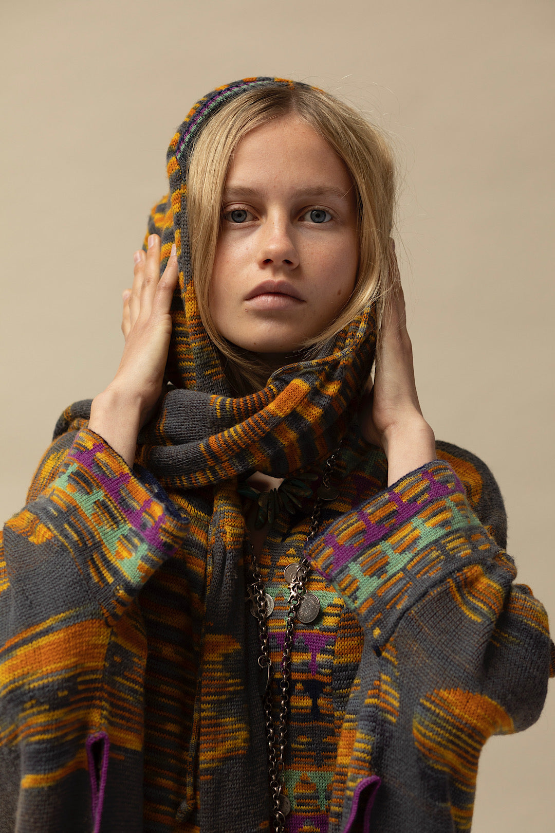 This rare Bill Gibb 1976/77 Byzantium Collection pure wool set features a long kimono with a fabulous ikat style print, tasselled scarf and hood combined, wide sleeves, two front patch pockets, and splits at each side. A true collectors piece.