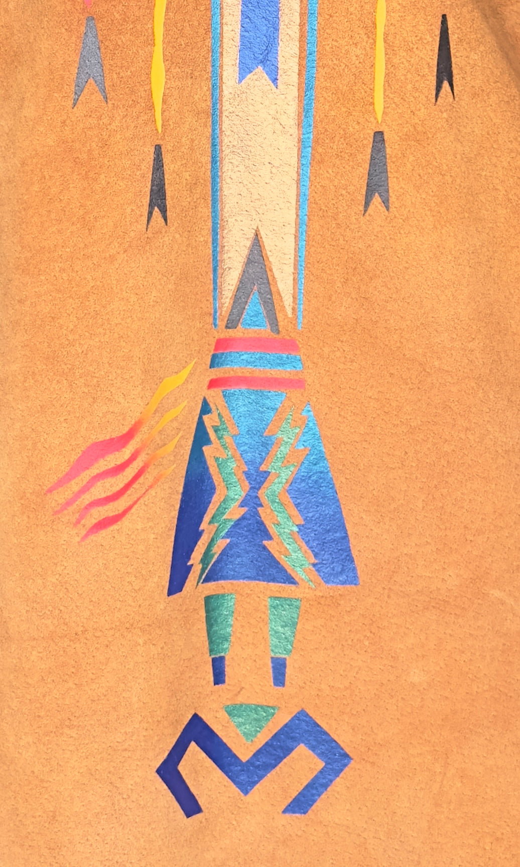 Discover a one-of-a-kind piece in this vintage suede leather jacket by Char Santa Fe. Featuring a hand painted corn maiden motif in yellow, this statement piece boasts beautiful quality with silver concho buttons, whip stitch edges in black leather, and shoulder pads.