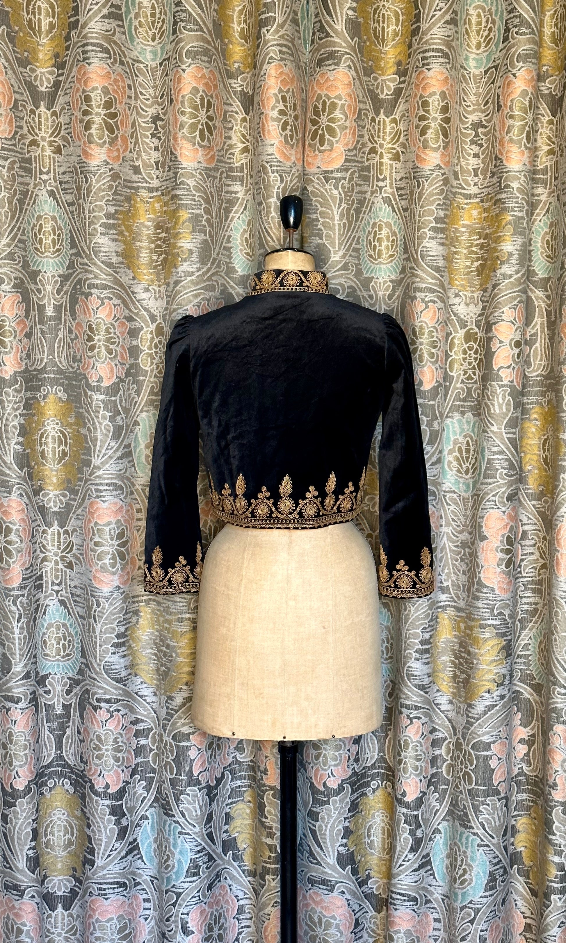 Handcrafted from velvet in the early 1900's, this exquisite jacket features traditional embroidery in the traditional style of Palestine from the turn of the century. Perfect for an elegant evening, this jacket can elevate any look with a hint of timeless sophistication.